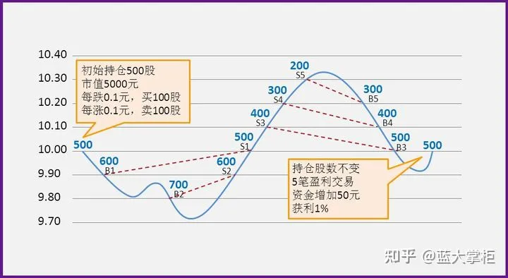 设置区间,网间距(1%~4%),每跌一格买入,每涨一个卖出,在区间内来回做操作